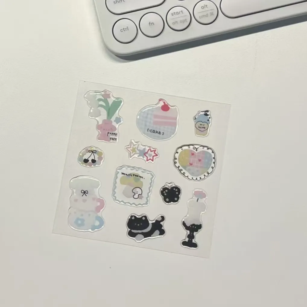 สติกเกอร์อีพอกซีเรซินการ์ตูน 3 มิติเป็นสติ๊กเกอร์ 3D แบบกำหนดเองที่มีการออกแบบธีมการ์ตูน สติกเกอร์แต่ละชิ้นถูกเคลือบด้วยชั้นอีพอกซีเรซินที่มีความโปร่งใสสูง ซึ่งบ่มด้วยกระบวนการหยดกาวเพื่อสร้างพื้นผิวที่ยกขึ้น เรียบเนียน และยืดหยุ่น