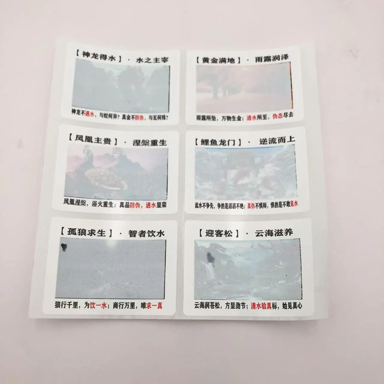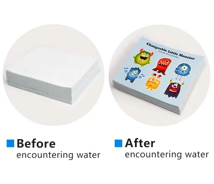 เพียงเติมน้ำเพียงเล็กน้อยเพื่อกระตุ้นการตอบสนองของฉลาก น้ำหนักเบาและพกพาสะดวก ฉลากสามารถสร้างได้หลายรูปแบบ เช่น การ์ดและการพิมพ์ภาพถ่ายทันใจโจโจ้แพ็คให้บริการปรับแต่ง เราสามารถพิมพ์ลวดลายการ์ตูน โลโก้แบรนด์ เนื้อหาส่งเสริมการขาย และอื่นๆ บนฉลากได้ เหมาะอย่างยิ่งสำหรับการ์ดอวยพรตามเทศกาล ของเล่นเพื่อการศึกษาสำหรับเด็ก การตลาดของแบรนด์ การต่อต้านการปลอมแปลง และการใช้งานอื่นๆ