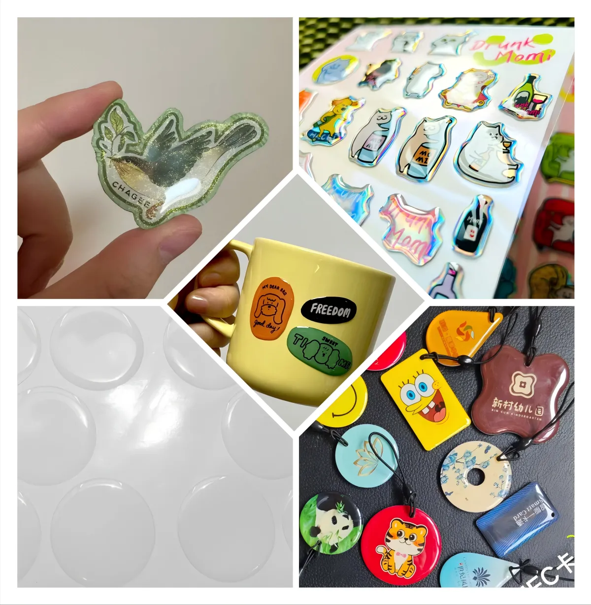 A1: เราใช้วัตถุดิบระดับพรีเมียม: พื้นผิวกาวที่ทนทาน (ไวนิล PET หรือกระดาษ) หมึกที่เป็นมิตรต่อสิ่งแวดล้อมสำหรับการพิมพ์ที่มีความละเอียดสูง และอีพอกซีเรซินเกรดอุตสาหกรรม เรซินช่วยให้สติ๊กเกอร์โดม 3 มิติมีความทนทานต่อการขีดข่วนและมีความเงางามยาวนาน