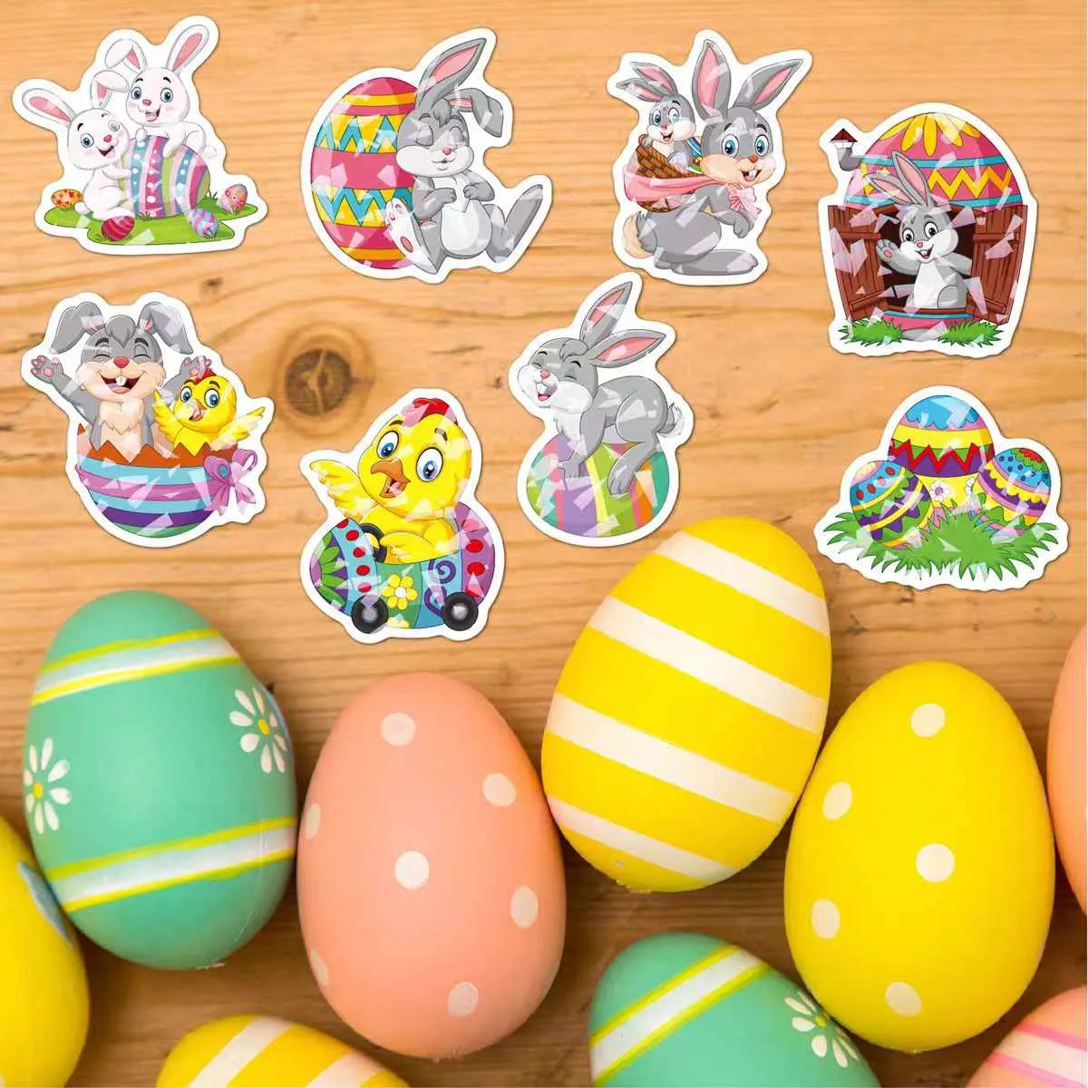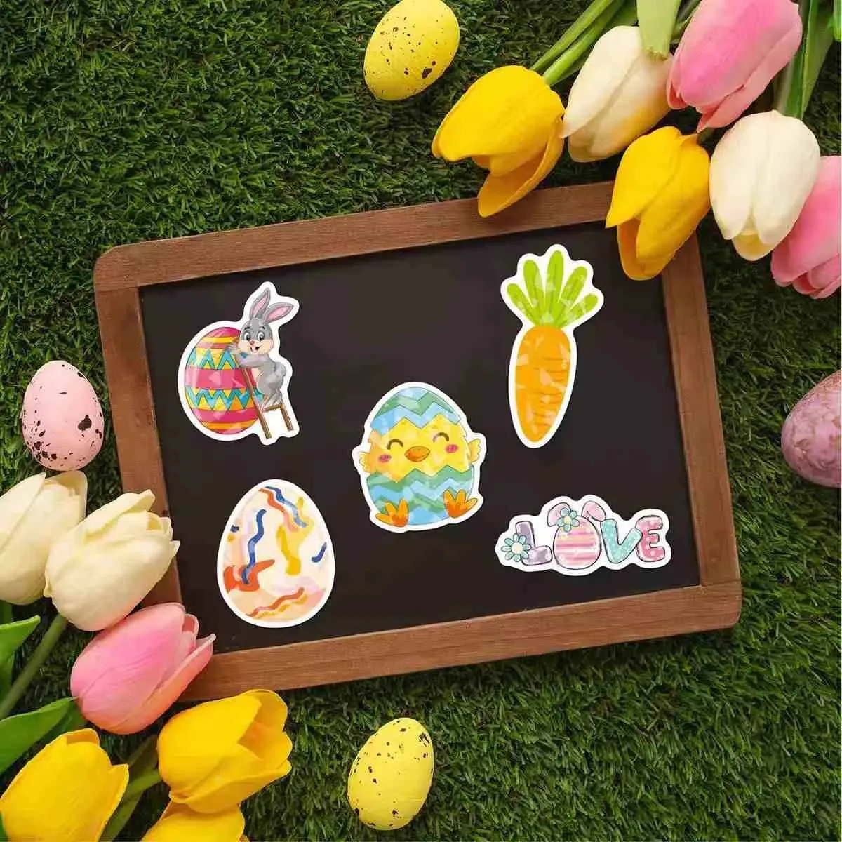 เหมาะสำหรับเทศกาลอีสเตอร์ต่างๆ: สติกเกอร์ขนาดเล็กสำหรับไข่หรือเปลือกช็อกโกแลต ขนาดกลางสำหรับกล่องของขวัญและตะกร้า และขนาดใหญ่สำหรับตั้งโชว์หน้าต่าง ลอกออกได้ง่ายโดยไม่มีสารตกค้างจากพื้นผิว เช่น แก้ว พลาสติก หรือไม้