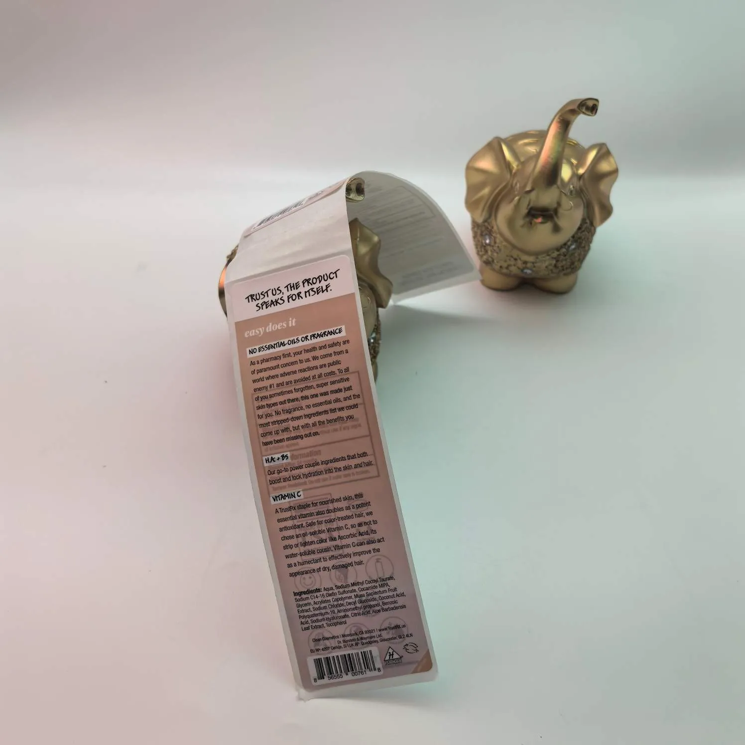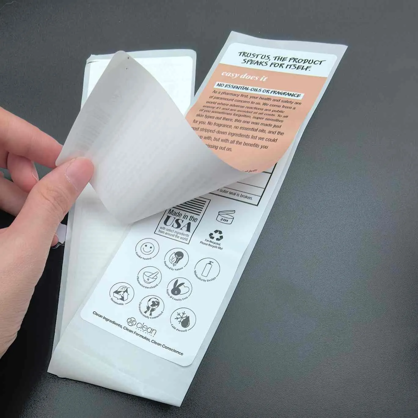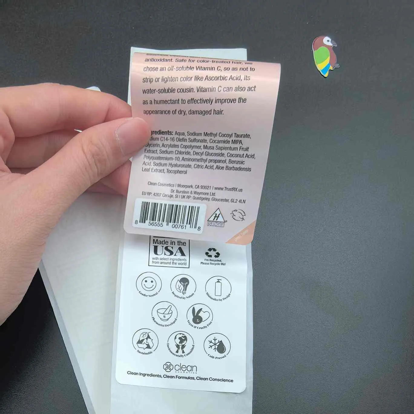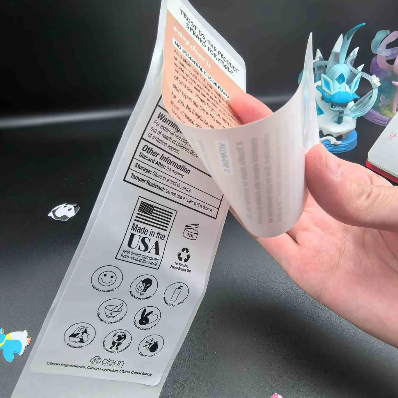ลอกและอ่านฉลาก:ประเภทพื้นฐานที่สุด เรียกอีกอย่างว่าฉลากเครื่องสำอางแบบหลายชั้น ชั้นบนลอกออกได้ง่าย และชั้นในมีข้อมูลที่ขยายออกไป มักใช้กับมาส์กหน้า เซรั่ม และผลิตภัณฑ์บรรจุภัณฑ์ขนาดเล็กอื่นๆ