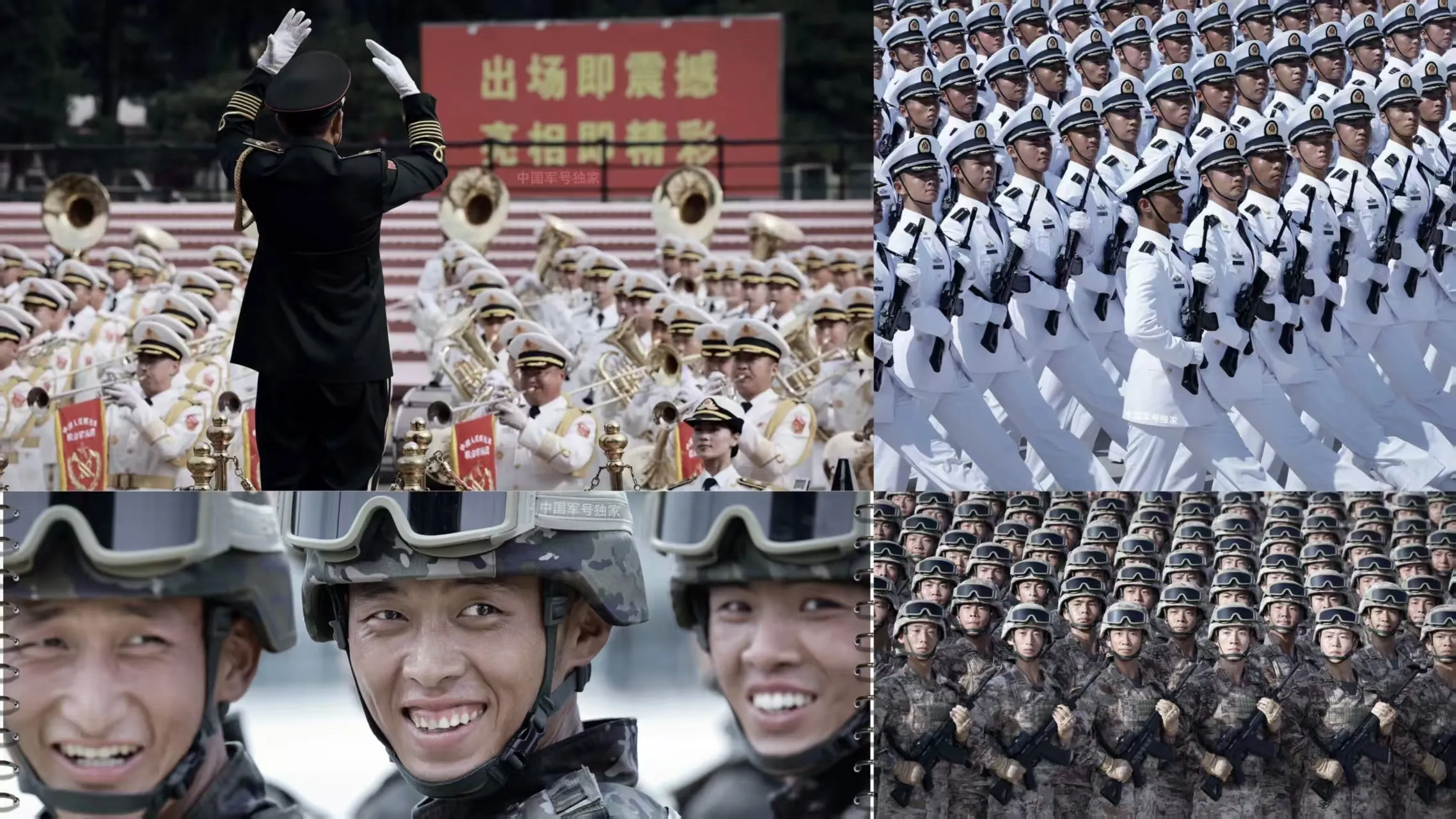 ในจัตุรัสเทียนอันเหมิน 45 การก่อตัวและระดับสูงผ่านไปตามลำดับและวงดนตรีทหารร่วมประกอบด้วยเจ้าหน้าที่และทหารมากกว่าหนึ่งพันคนเล่นเสียงอันทรงพลังของยุค