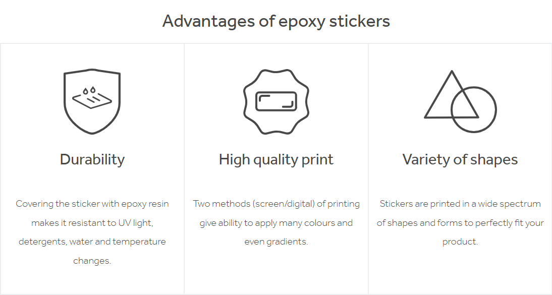 สติ๊กเกอร์อีพ็อกซี่ (หรือที่เรียกว่าสติ๊กเกอร์ 3 มิติs หรือสติกเกอร์โดม) เป็นสติกเกอร์พิมพ์สีทั้งเล่มเคลือบด้วยอีพอกซีเรซินใสกันน้ำ การประยุกต์ใช้เทคนิคการพิมพ์ดิจิทัลหรือการพิมพ์สกรีนส่งผลให้ได้ความละเอียดสูงและการออกแบบที่มีรายละเอียดสูง