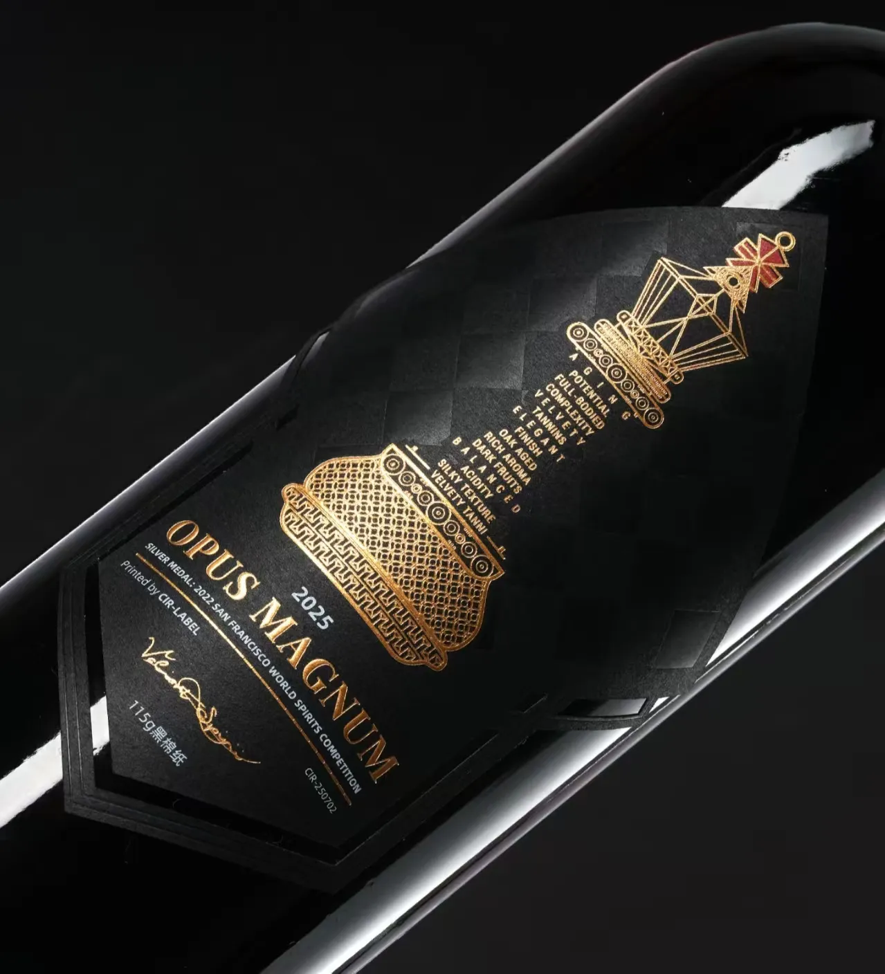 นี้ฉลากไวน์มีการปั๊มฟอยล์สีทองอย่างกว้างขวาง พื้นหลังสีดำจับคู่กับลวดลายเส้นสีทอง ในขณะที่ข้อความใช้การผสมผสานระหว่างสีทองและสีขาว ความสว่างของสีทองและความแวววาวของการปั๊มฟอยล์ พร้อมด้วยลวดลายและข้อความที่ยกขึ้นเล็กน้อย สร้างความโดดเด่นและการแบ่งชั้นที่ชัดเจน มอบสุนทรียศาสตร์ที่หรูหราและคลาสสิก